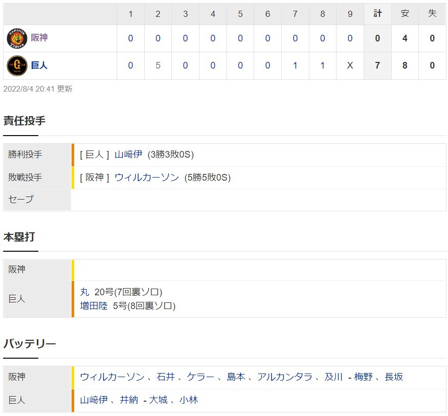 巨人7ー0阪神 試合結果 東京ドーム 2022/8/4