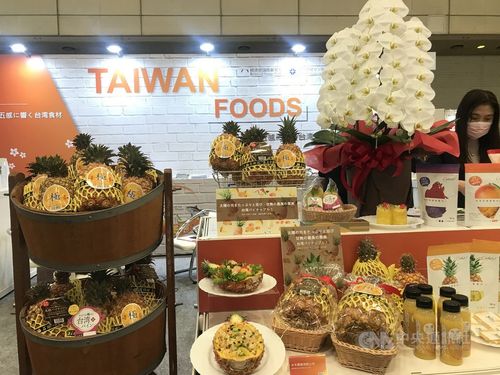 「フーデックスジャパン」の台湾パビリオンで展示される台湾産パイナップル=3月9日、千葉県
