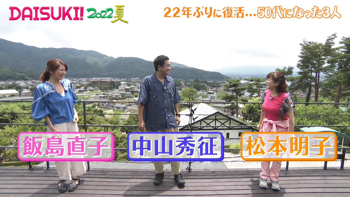 中山さんは松本さん、飯島さんに挟まれた3ショットをアップしながら「いよいよ!! 本日21:00~BS日テレにて『DAISUKI!2022夏』放送です!!」と、同番組の復活を告知。また松本さんもブログで「懐かしの3人組で山梨へアウトドア旅行 22年前に戻った気持ちで楽しみました!」と緑に囲まれ釣り竿を手にしたショットや、高台での3ショットを公開しています。