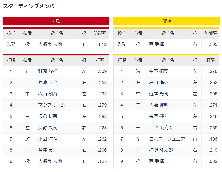 広島ー阪神 スタメン マツダスタジアム 2022/8/5