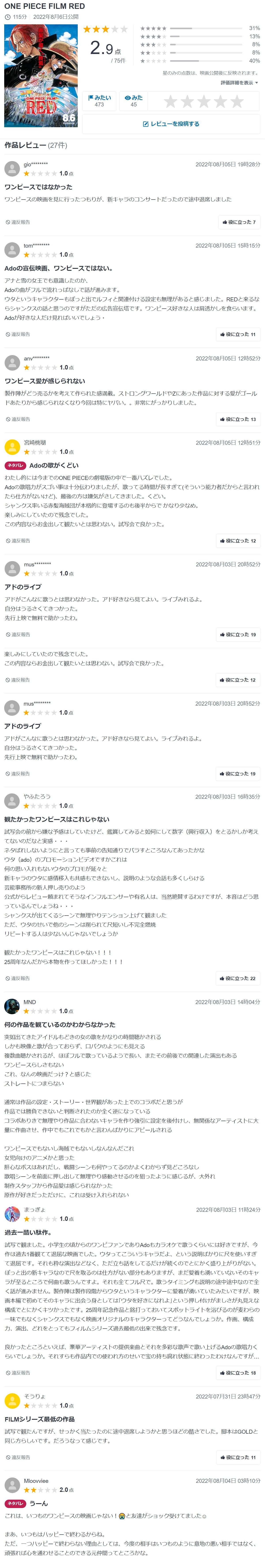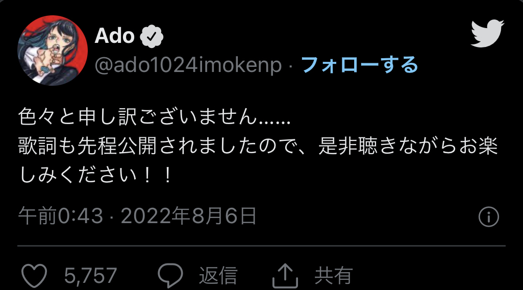 【画像】Adoさん、「ONE PIECE FILM RED」公開初日に謝罪! 評価の方も微妙な結果に…