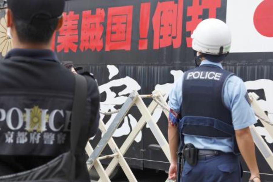 主催者側は会場の場所を公表せず予約者のみに案内。観覧者の荷物は金属探知機で検査した。会場周辺では、制服、私服姿の警察官が目立った。府警は街宣車に対し、柵で道路を封鎖して接近を防いだ。街宣車は