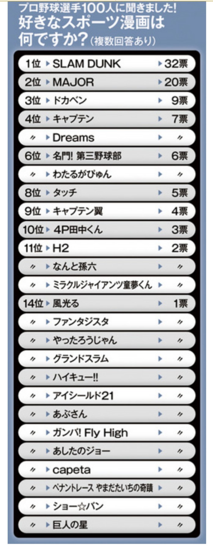 【悲報】プロ野球選手100人に聞きました!好きなスポーツ漫画はなんですか?
