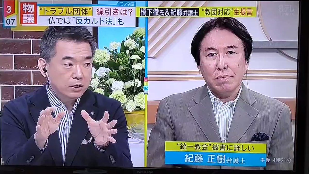 司会の宮根誠司(59)らと共にスタジオ出演していた橋下氏。中継先にいた紀藤氏の「反カルト法のような法律を導入すべき」という提言に、「反カルトというのは、あくまでも宗教に絞った規制。でも、(信者が)信じているのはしょうがない。だから教義内容や内心に踏み込むのは危険」と返した。