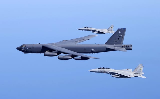 共同訓練する米空軍のB52爆撃機(中央)と航空自衛隊のF15戦闘機(2018年7月、日本海上空、航空自衛隊提供)=共同