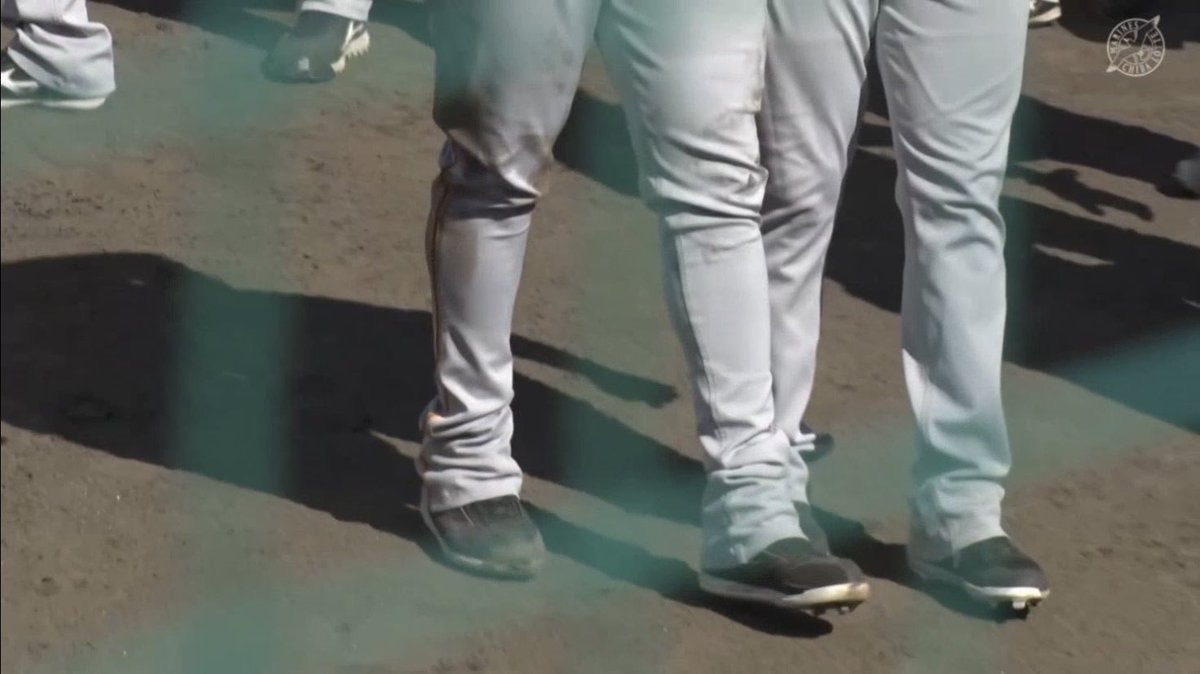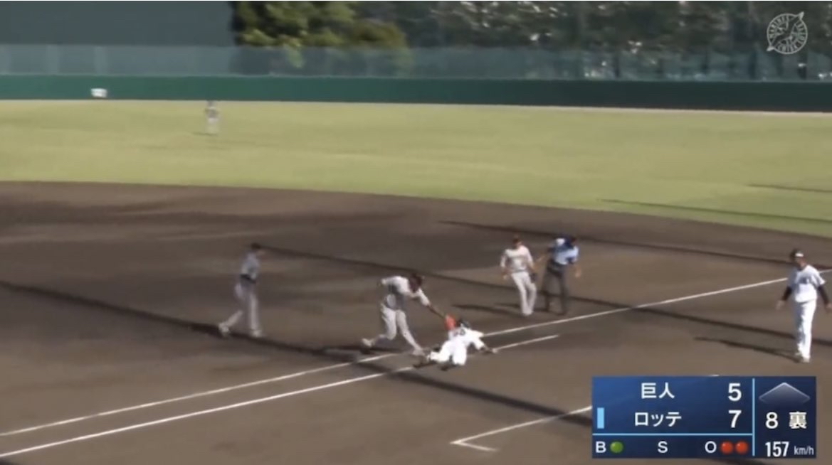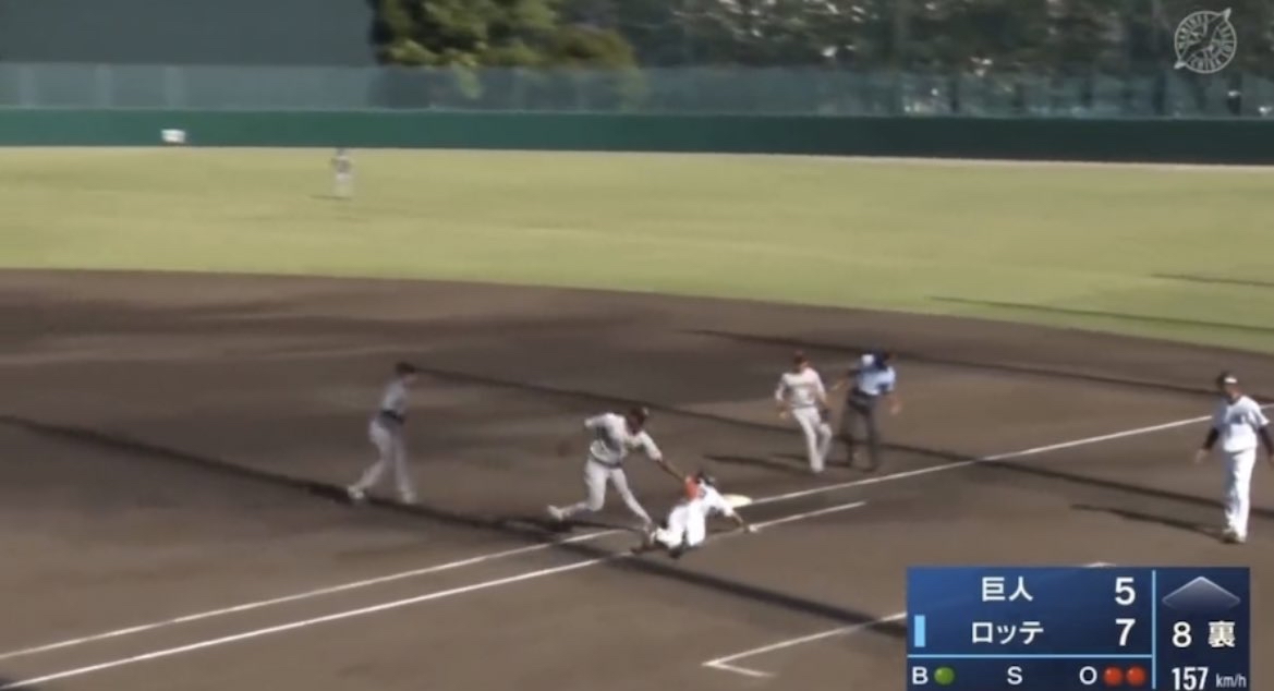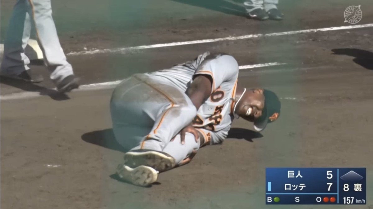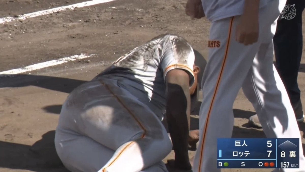 八回からマウンドに上がり、2死から西巻の一塁方向へのセーフティーバントを捕球。自ら打者走者にタッチしたが、勢いよく地面に倒れ込み、膝を押さえた。その後、同僚選手の肩を借りながら、足を引きずってグラウンドを後にした。