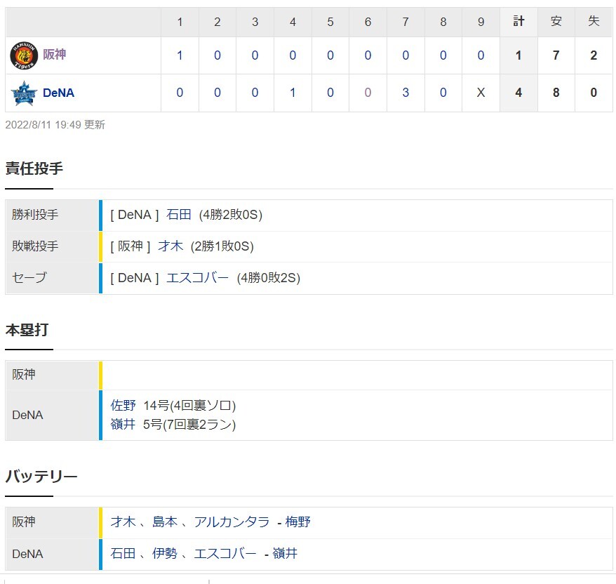 DeNA4ー1阪神 試合結果 横浜スタジアム 2022/8/11