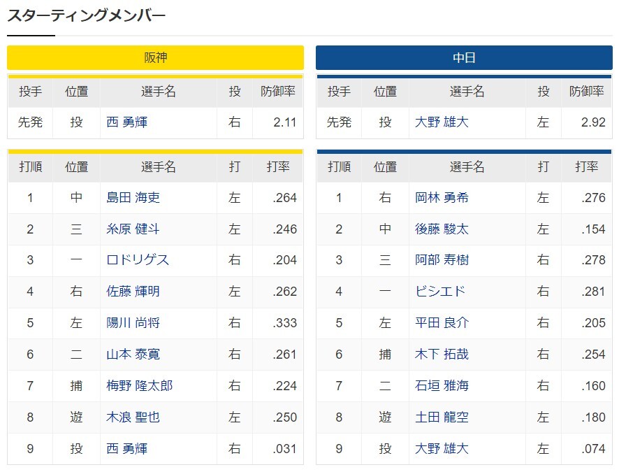 阪神ー中日 スタメン 京セラドーム大阪 2022/8/12