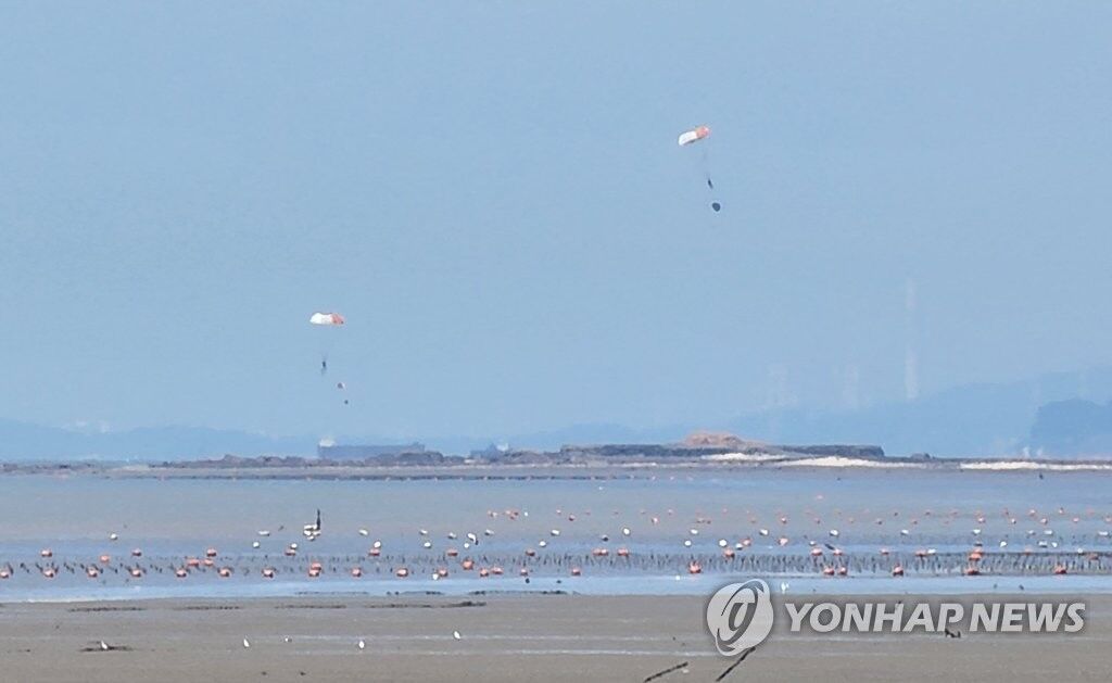韓国空軍は12日、同日午後0時20分ごろ、空軍戦闘機のF4E(通称ファントム)1機が北西部・京畿道華城市沖の黄海に墜落したと発表した。操縦士2人は緊急脱出し、命に別条はない。パラシュートで脱出した操縦士2人(読者提供)=(聯合ニュース)