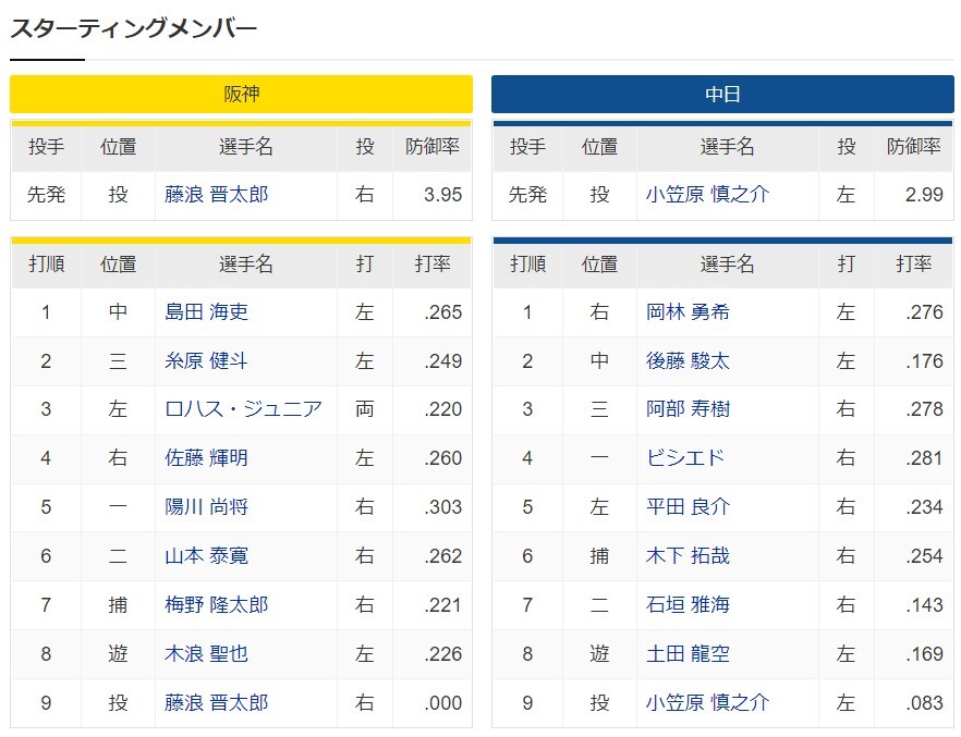 阪神ー中日 スタメン 京セラドーム大阪 2022/8/13