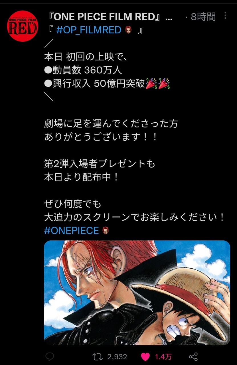 【速報】「ワンピースフィルムレッド」さん、早くも“50億”突破wwwwwwww