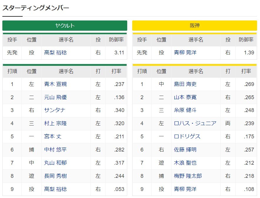 ヤクルトー阪神 スタメン 神宮球場 2022/8/16