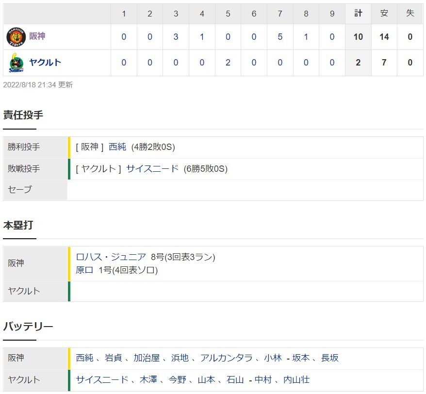 ヤクルト2ー10阪神 試合結果 神宮球場 2022/8/18