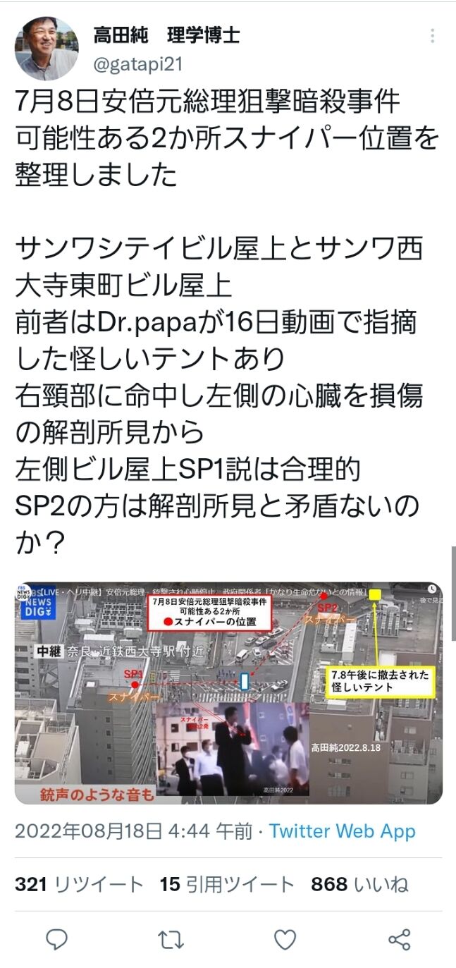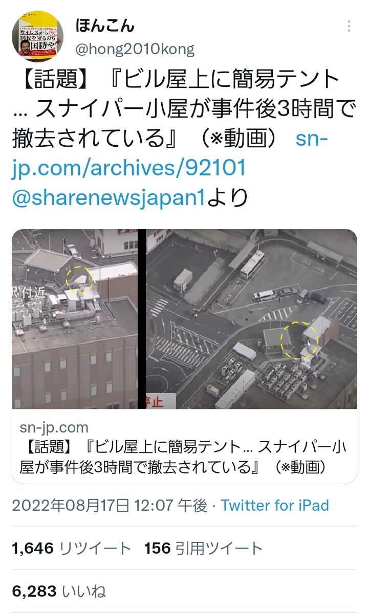 【New】安倍晋三元首相の事件で、現場近くのビル屋上に「スナイパー小屋がある」とする動画やツイートが拡散しています。