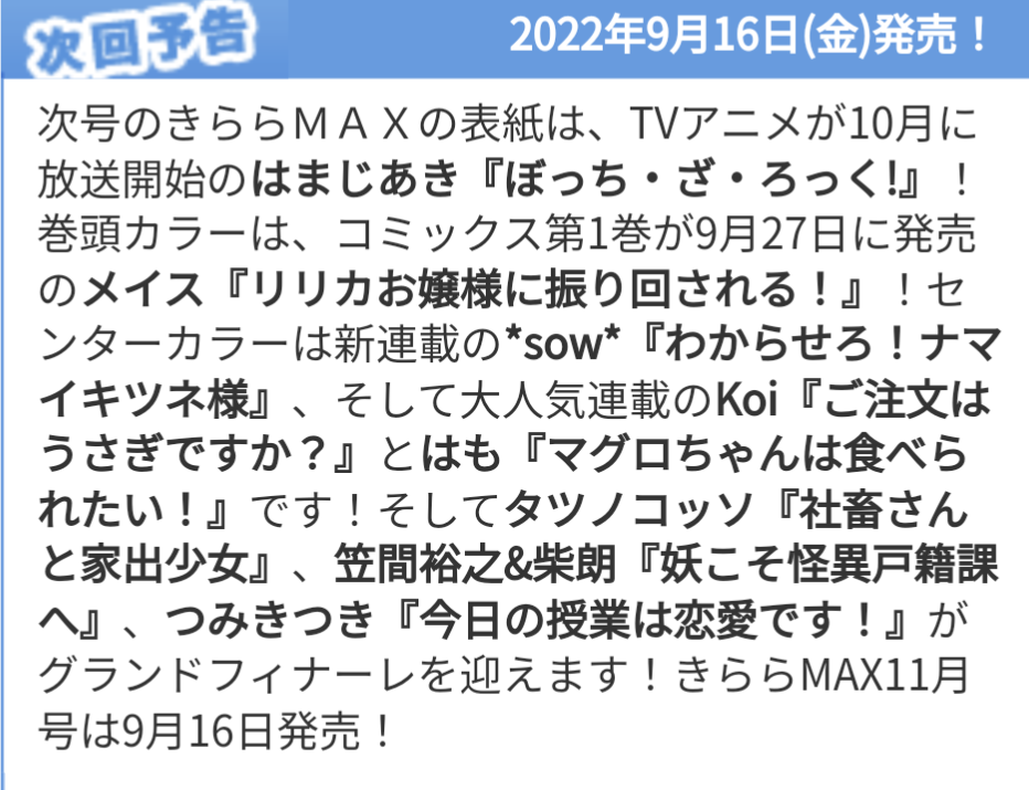 【悲報】きららMAXさん、11月号で「3作品同時」グランドフィナーレへ…