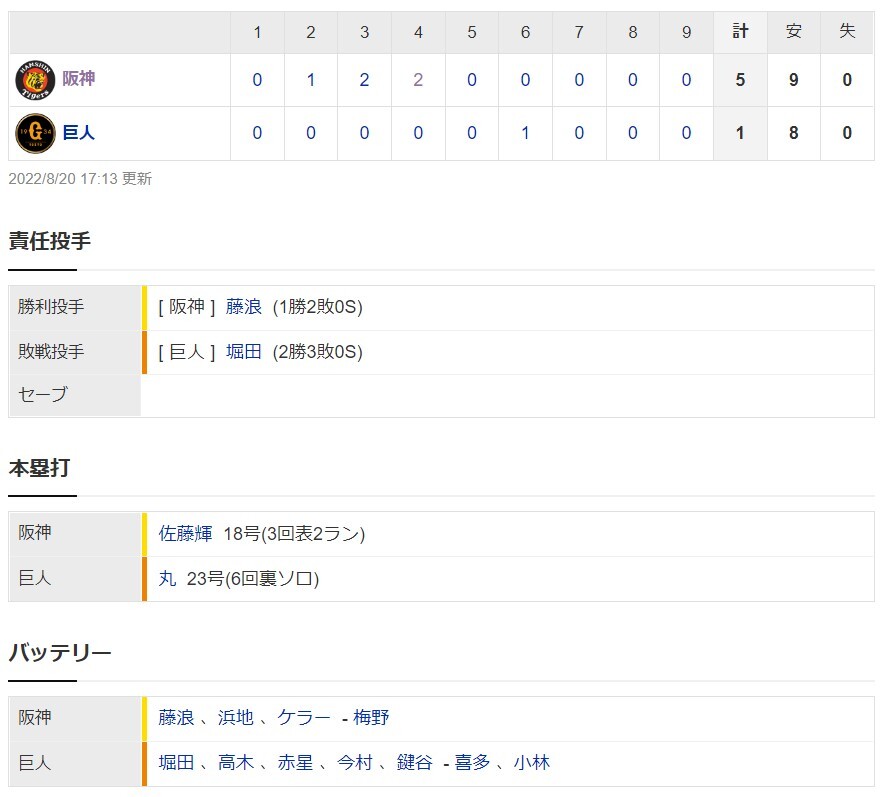 巨人1ー5阪神 試合結果 東京ドーム 2022/8/20