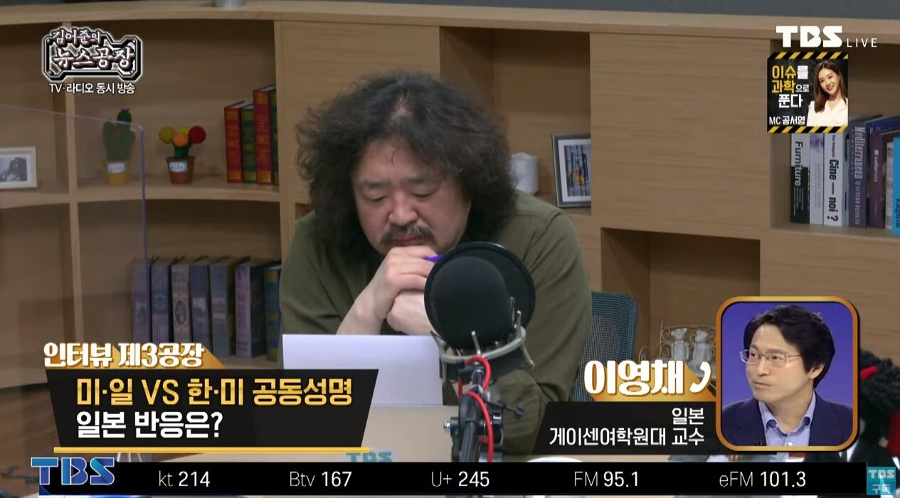 ▲22日TBS ‘キム・オジュンのニュース工場’とインタビューするイ・ヨンチェ教授