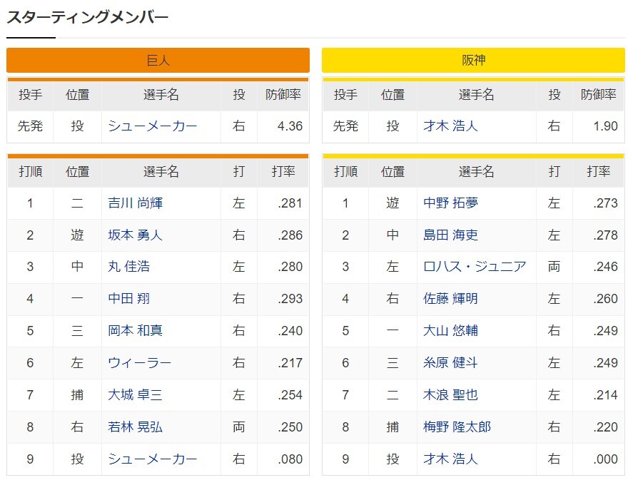 巨人ー阪神 スタメン 東京ドーム 2022/8/21