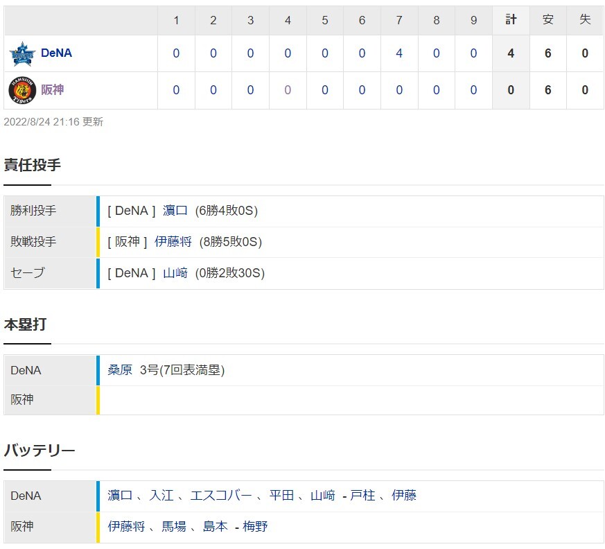 阪神0ー4DeNA 試合結果 京セラドーム大阪 2022/8/24