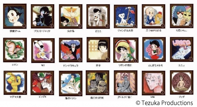 鉄腕アトム、ブラックジャック、リボンの騎士、どろろ、ジャングル大帝、火の鳥、ブッダ、アドルフに告ぐ、三つ目がとおる、七色インコ