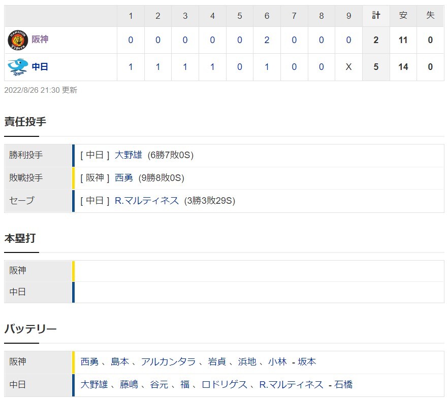 中日4ー2阪神 試合結果 バンテリンドーム 2022/8/26
