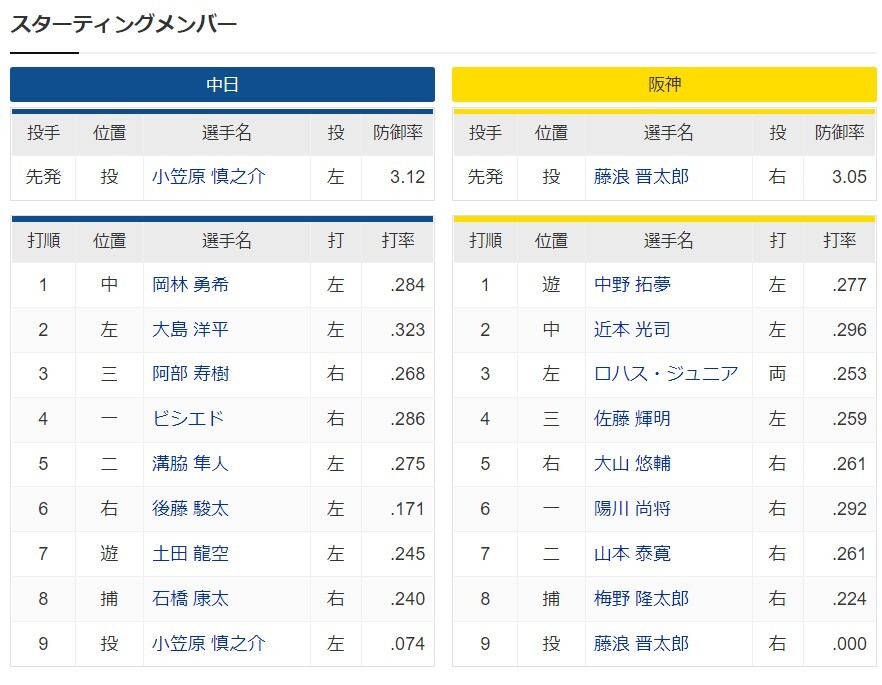 中日ー阪神 スタメン バンテリンドーム 2022/8/27