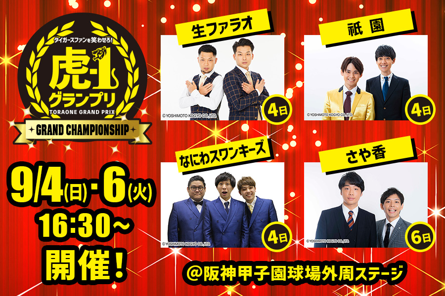 タイガースファンを笑わせるための大会「#虎ー1グランプリ」のグランドチャンピオンシップを、9/4(日)と9/6(火)の2回に分け、甲子園球場外周ステージにて、16:30より開催します!