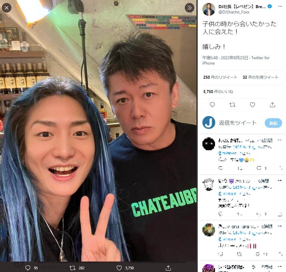 音楽グループ「Repezen Foxx」のDJ社長さんが2022年8月23日にツイッターを更新し、ホリエモンこと実業家の堀江貴文さんとのツーショットを公開した。写真に写る堀江さんの姿にネット上で反響が集まっている。