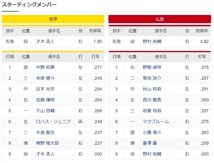 阪神ー広島 スタメン 甲子園球場 2022/9/1