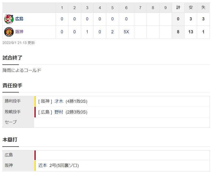阪神8×ー0広島 試合結果 甲子園球場 2022/9/1