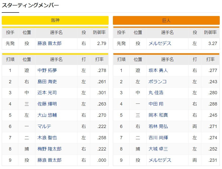阪神ー巨人 スタメン 甲子園球場 2022/9/3
