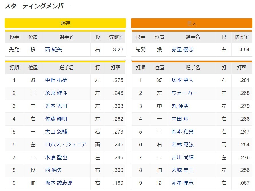 阪神ー巨人 スタメン 甲子園球場 2022/9/4