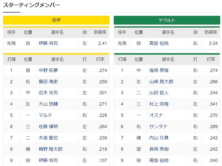阪神ーヤクルト スタメン 甲子園球場 2022/9/7