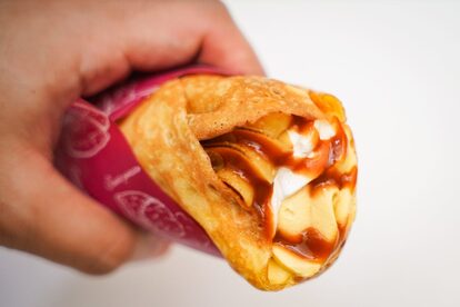 「もっちり」とした食感が特長のクレープ生地で練乳入りホイップとさつまいもクリームを包んだ一品で、3種の中で最も高額。これは期待が高まる。