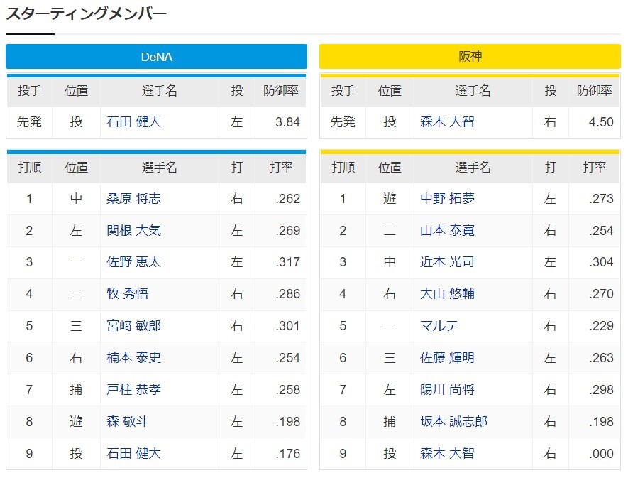 DeNAー阪神 スタメン 横浜スタジアム 2022/9/10