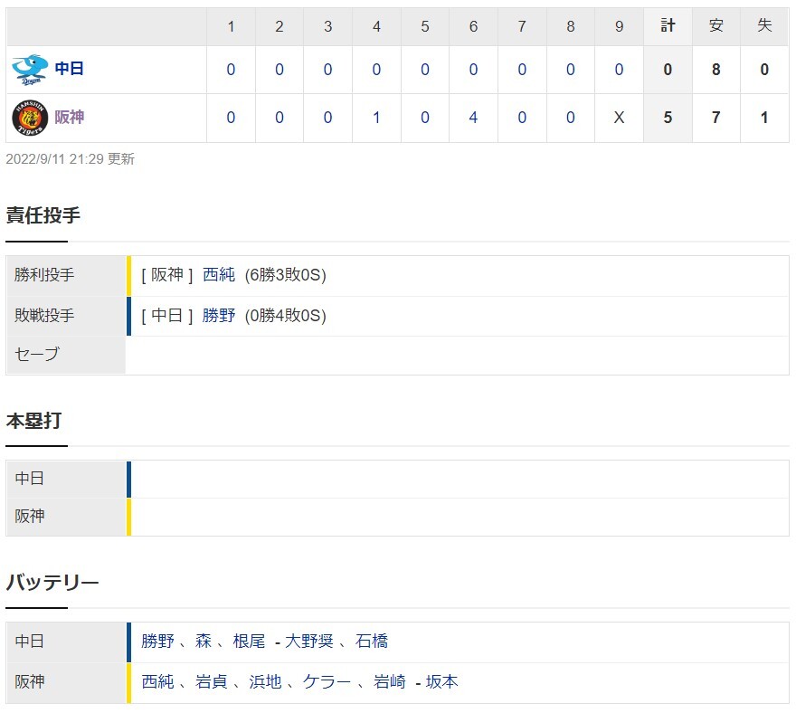 阪神5ー0中日 試合結果 甲子園球場 2022/9/11