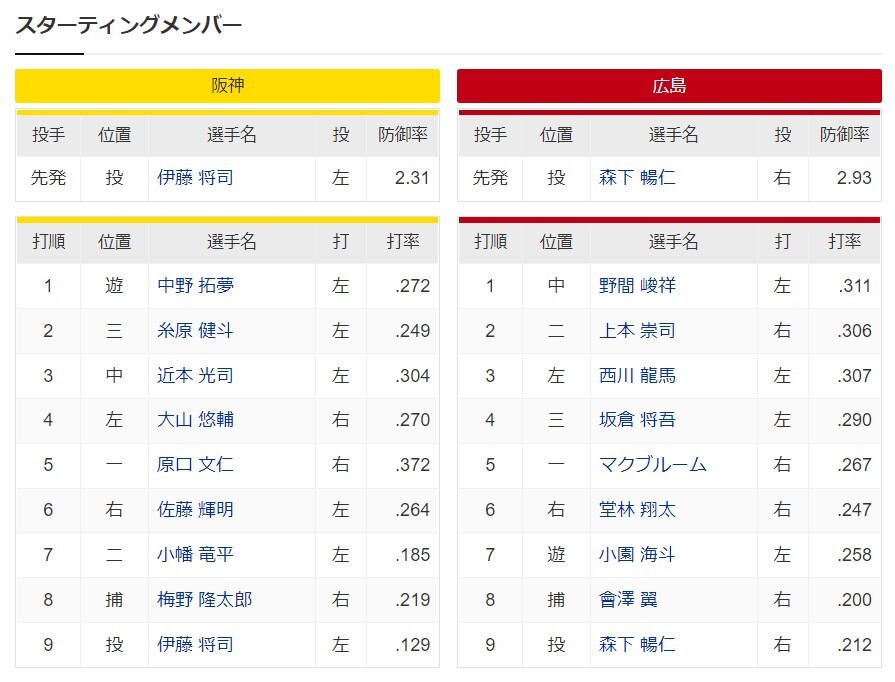 阪神ー広島23回戦のスタメンとベンチ入りです。