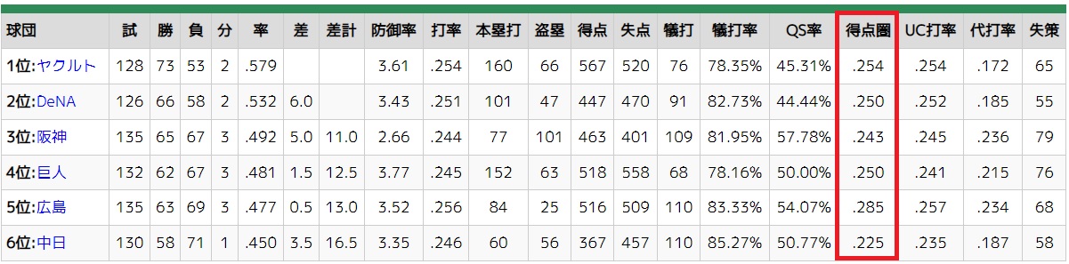 12球団のチーム得点圏打率wwywwywwywwywwywwywwy