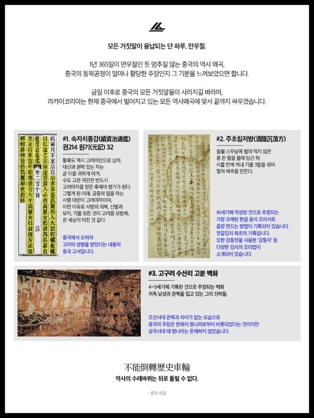 LAKAI KOREAは「きょう以降、中国のあらゆるうそが消えることを願いつつ、LAKAI KOREAは現在中国で繰り広げられているあらゆる歴史歪曲に立ち向かい、最後まで戦う」と付け加えた。