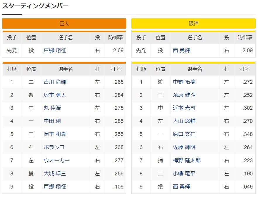 巨人―阪神 スタメン 東京ドーム 2022/9/17