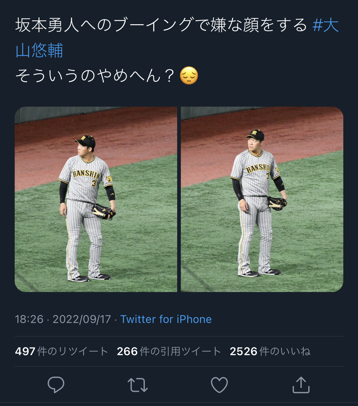 【朗報】阪神・大山、坂本勇人へのブーイングにお怒り