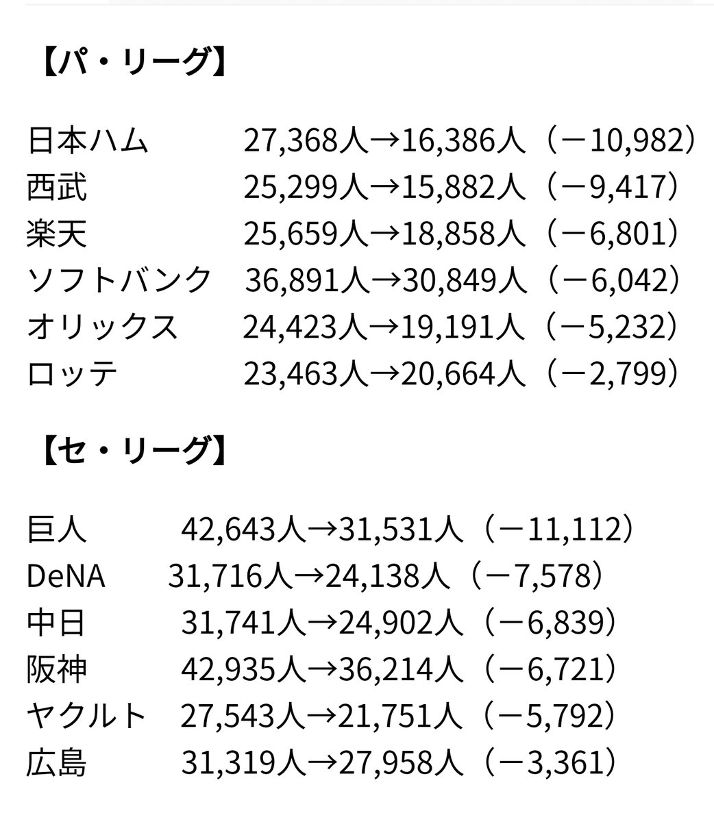 𝔲𝔱𝔰𝔲𝔰𝔢𝔪𝔦@utsusemi_dreamプロ野球平均観客動員数