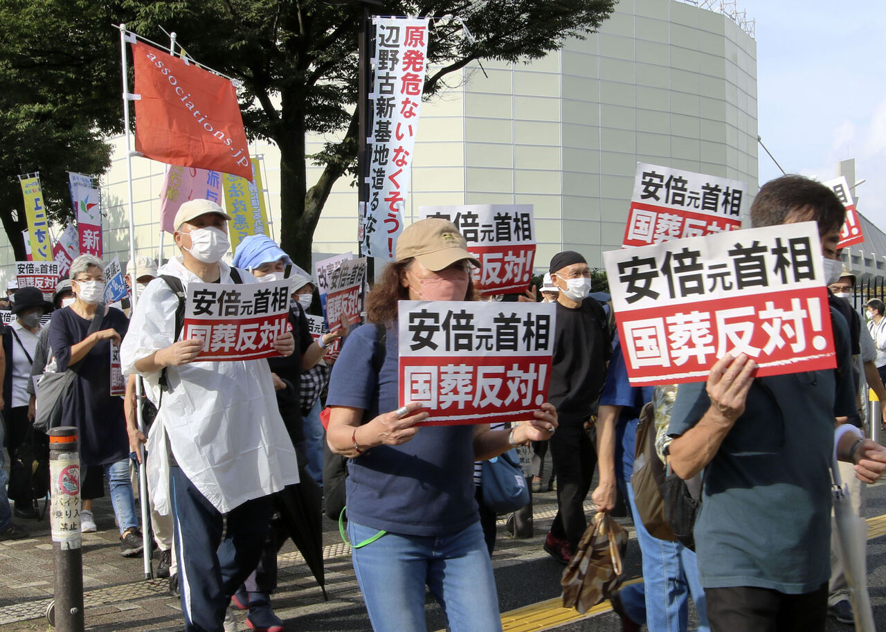 集会では、呼びかけ人の1人であるルポライター鎌田慧さんが、国葬実施が国会の審議がないまま決まったことを踏まえ、「国葬に根拠は全くない。何でも勝手に閣議で決める姿勢は封建主義的だ」と批判した。共産党の志位和夫委員長、社民党の福島瑞穂党首も登壇した。