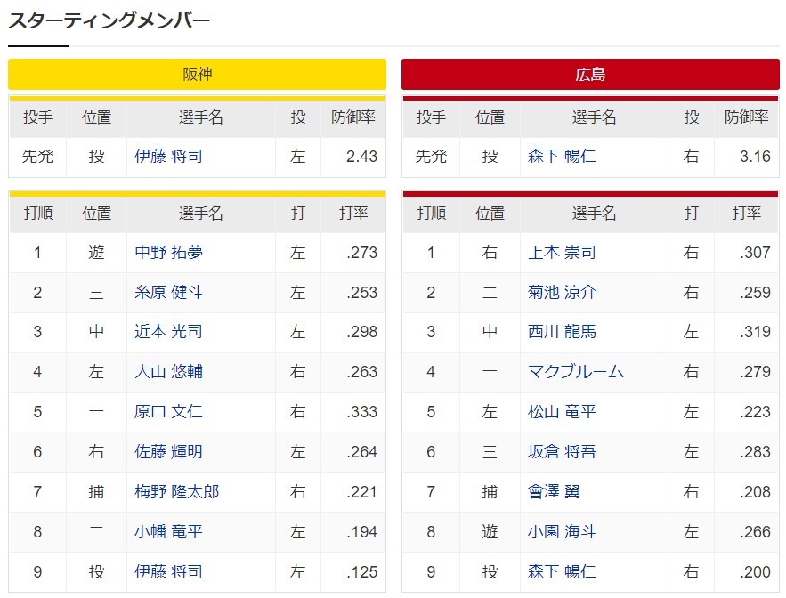 阪神ー広島 スタメン 甲子園球場 2022/9/21
