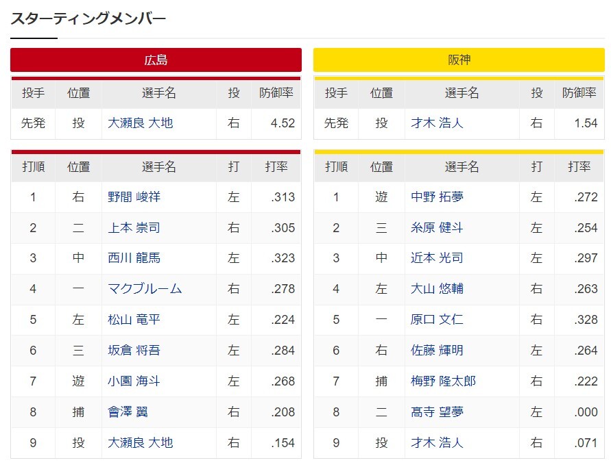 広島ー阪神 スタメン マツダスタジアム 2022/9/23