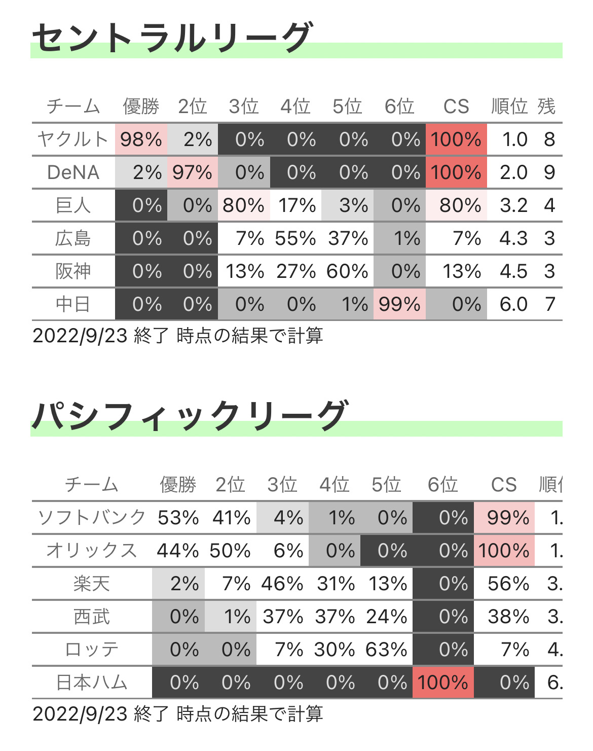 【9/23】セ・リーグ「3位争い」巨人80% 阪神13% 広島7%