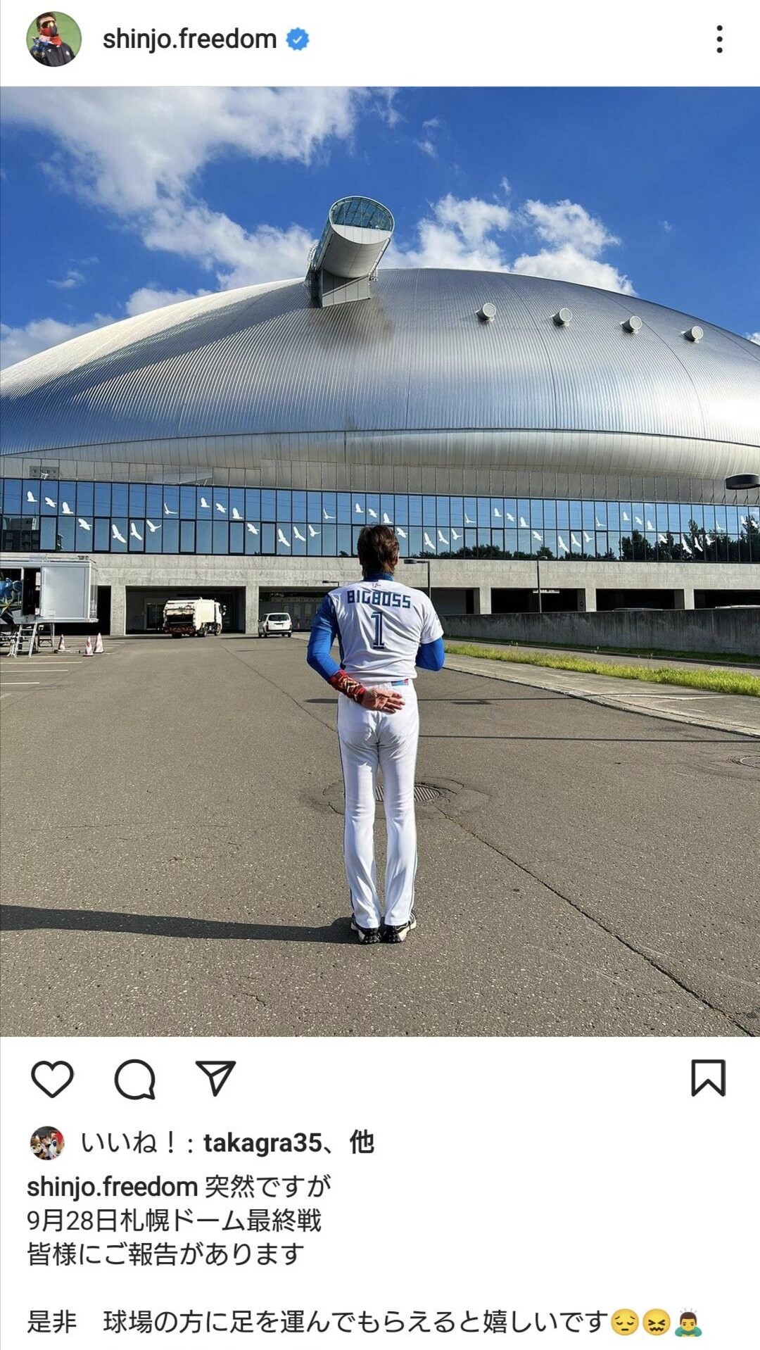 「突然ですが、9月28日の札幌ドーム最終戦 皆様にご報告があります」と投稿した。