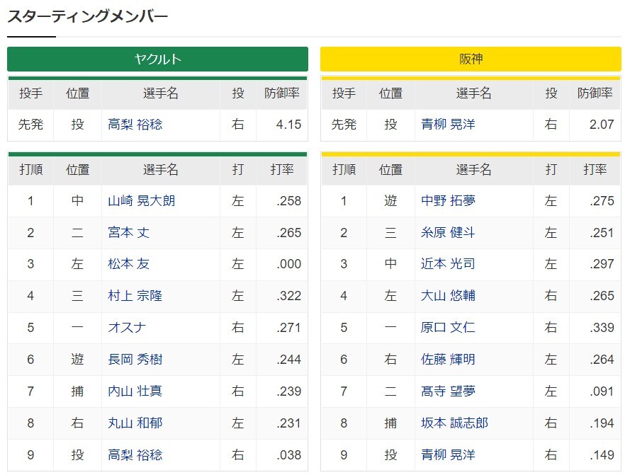 ヤクルトー阪神 スタメン 神宮球場 2022/9/27