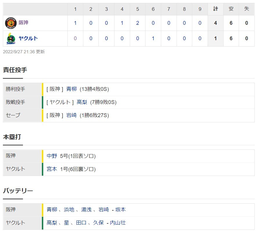 ヤクルト1ー4阪神 試合結果 神宮球場 2022/9/27