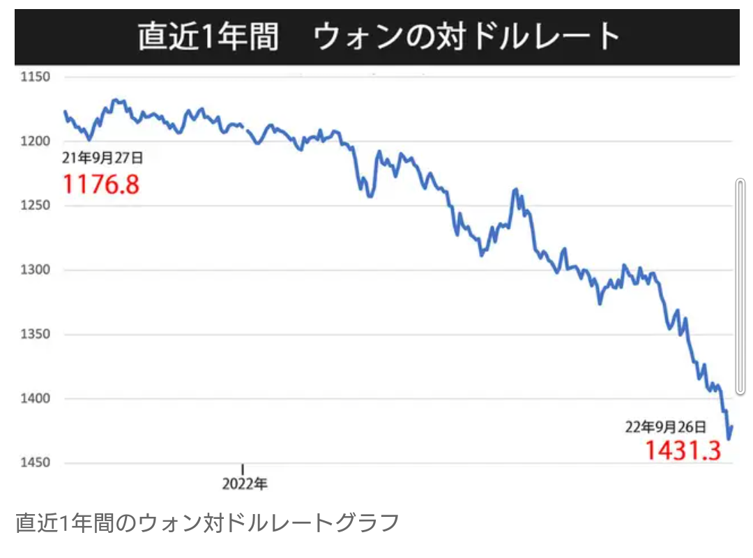 9月23日、朝鮮日報は社説「13年ぶりの1ドル=1400ウォン台、韓国経済に迫る『複合危機』信号弾」(韓国語版)で「危機の再来」に警告を発しました。